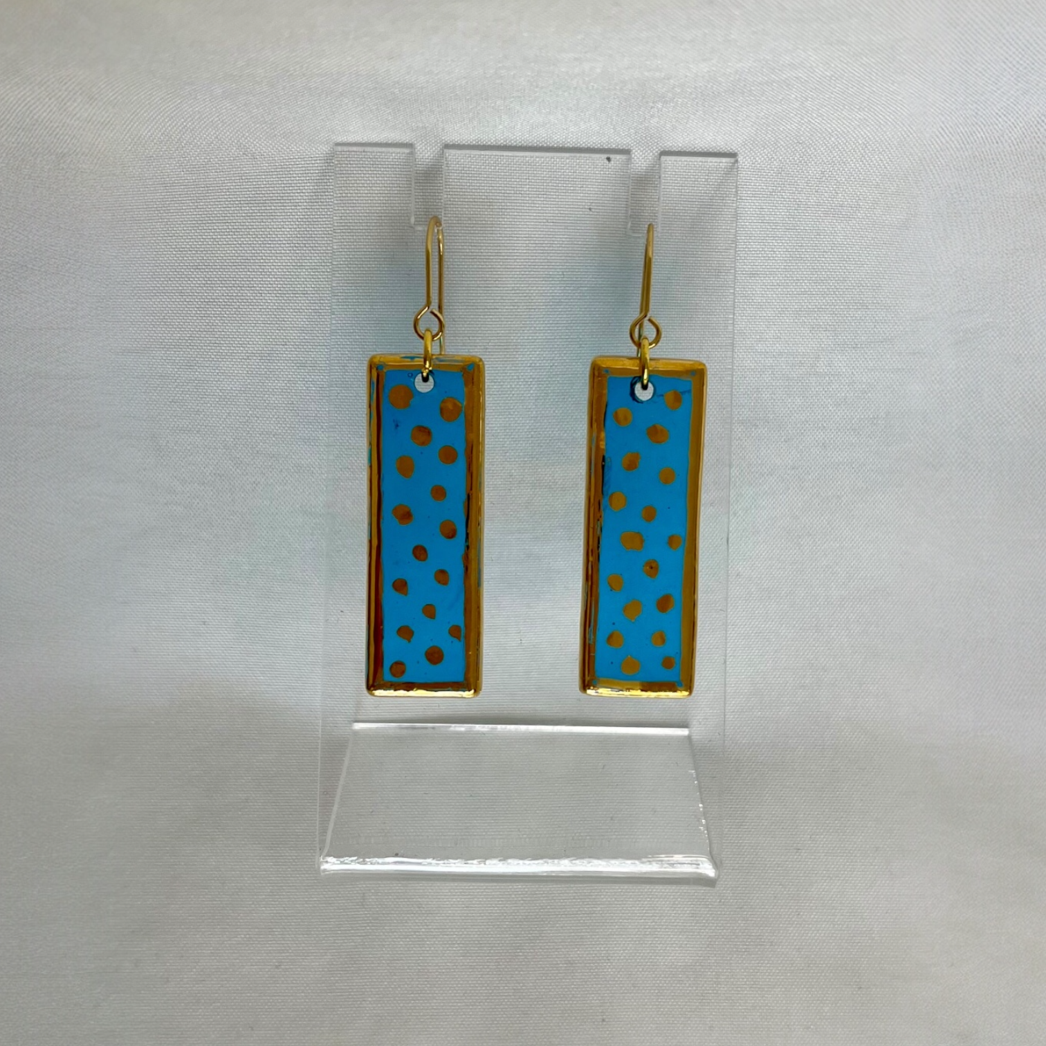 Hand cut clear glass that we then hand paint and kiln fire. 14k gold plated earring hooks.