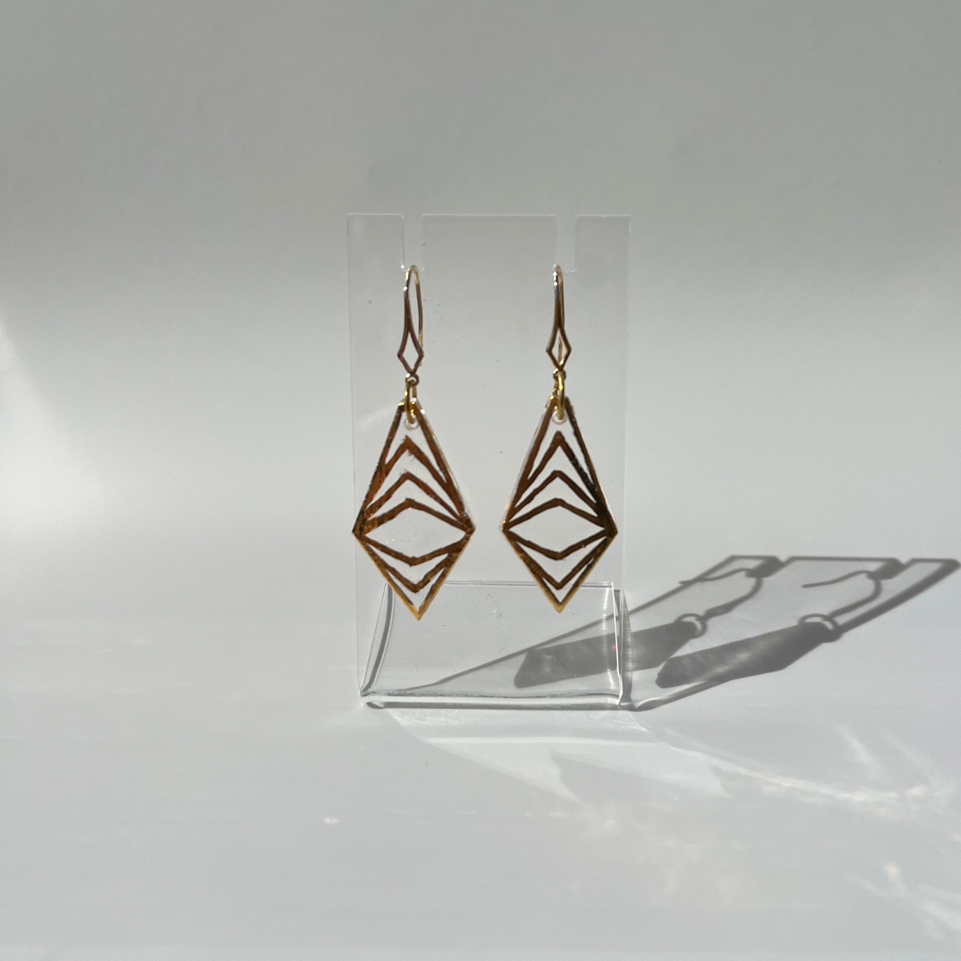 Hand cut clear glass that we then hand paint and kiln fire. 14k gold plated earring hooks.