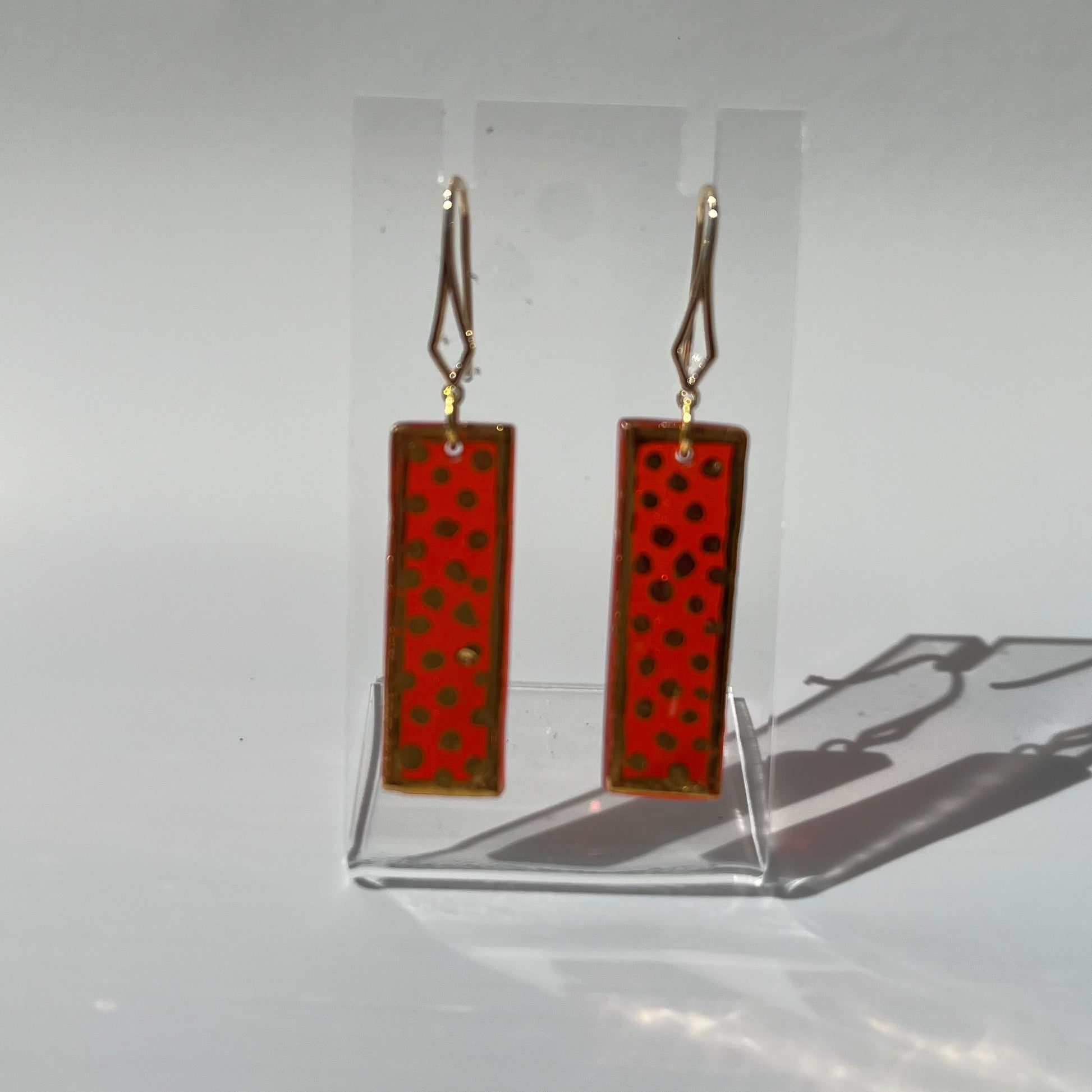 Hand cut orange iridescent glass that we then hand paint and kiln fire. 14k gold plated earring hooks.