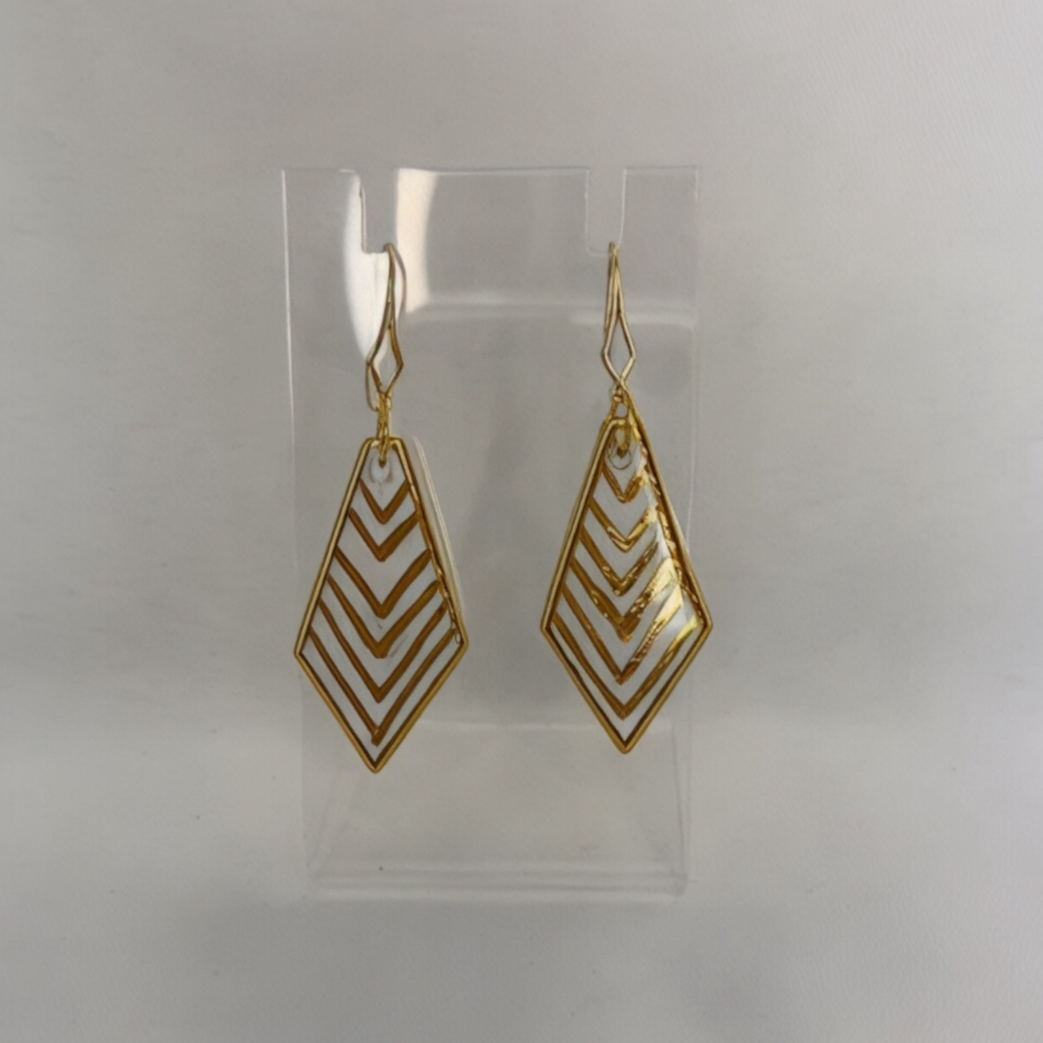 Hand cut clear glass that we then hand paint and kiln fire. 14k gold plated earring hooks.