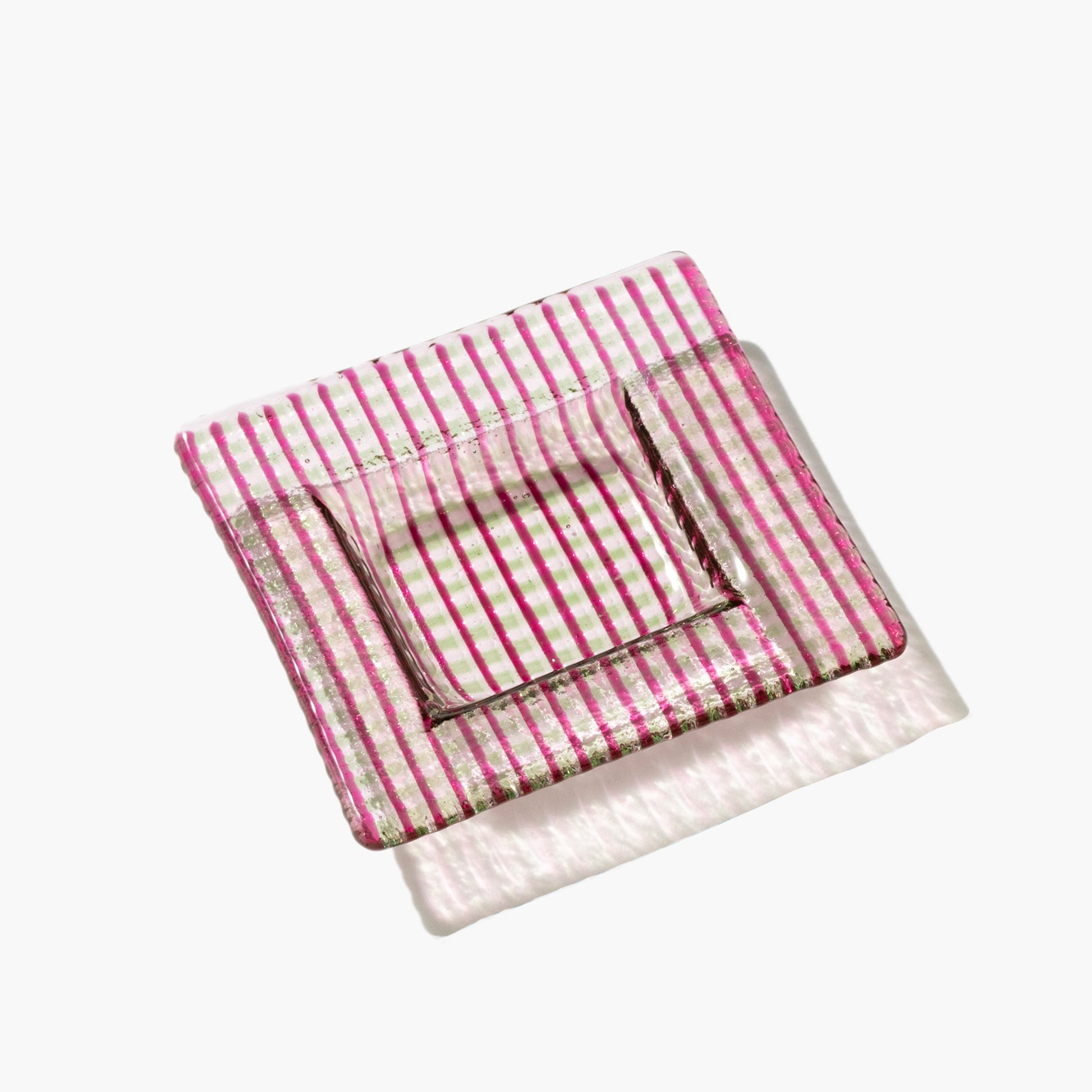 The colours are limitless! These little dishes are perfect to have to place your rings in at the end of the day. They also make excellent little soap holders for a guess bathroom. Or can be used with an incense cone in your lounge room. Thin cane glass (called ‘stringer’) is laid over a base sheet of clear or coloured glass and fired and then slumped in the kiln. Contact us if you have a specific colour combination and they can be made to order.