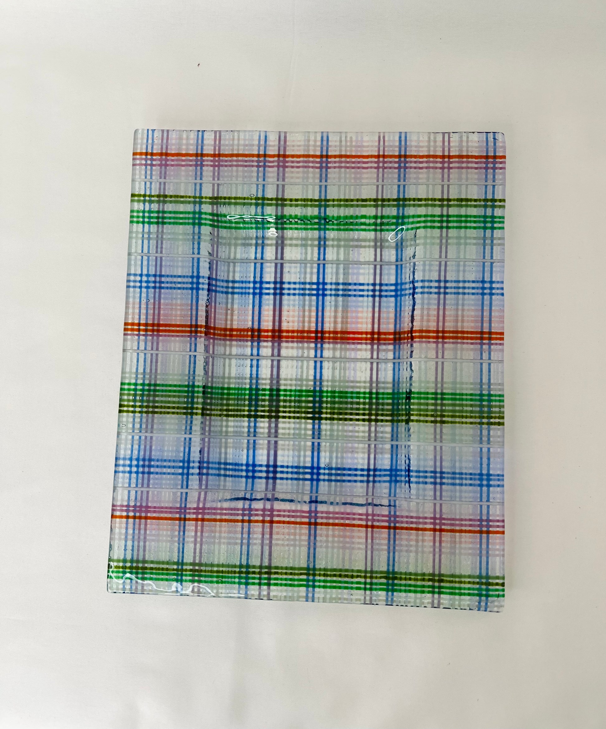 This dish/plate suits food serving (crackers, chocolates or antipasto dishes) or dish for your jewellery. Thin cane glass (called ‘stringer’) is laid over a base sheet of clear or coloured glass to give a "plaid" effect. It is then fired and a second firing in a mould (slumping) in the kiln. Contact us if you have a specific colour combination and they can be made to order. 17cm x 21cm.