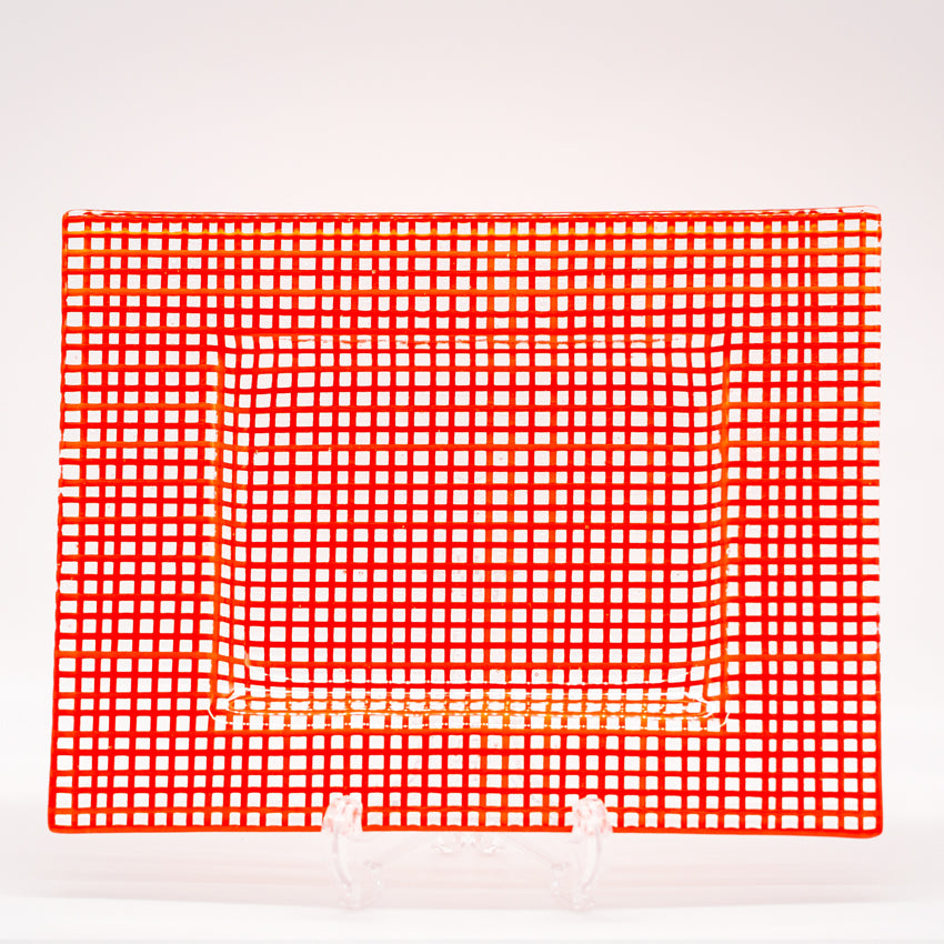 This dish/plate would also suit food serving (crackers, chocolates or antipasto dishes). Thin cane glass (called ‘stringer’) is laid over a base sheet of clear or coloured glass and fired and then slumped in the kiln. Contact us if you have a specific colour combination and they can be made to order.