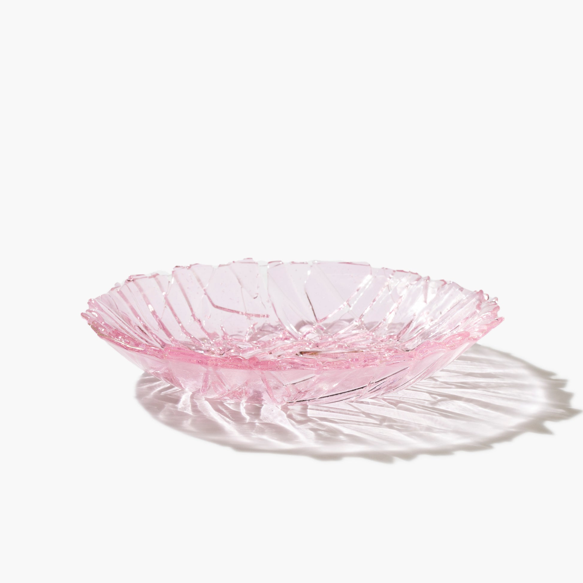 Transparent irregular shape and size glass shards are laid on a circle-shaped sheet of glass that I have cut. It is then kiln-fired (the first firing is to fuse the glass and the second firing is to slump it into the mould) to make a bowl measuring 25cm in diameter.